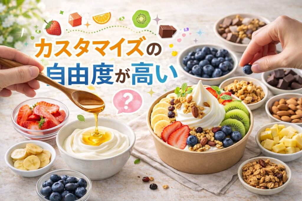 ヨアジョンの魅力として外せないのが、自分好みに自由にカスタマイズできる点です。ベースとなるヨーグルトアイスに対して、フルーツやナッツ、グラノーラ、チョコレートなどを自由に組み合わせることで、毎回違った味わいを楽しめます。